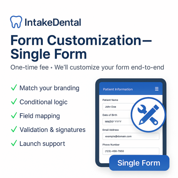 - One fully customized form in Intake Dental / Dental Forms Pro (e.g., New Patient Intake, Medical History, Consent, or Specialty form)